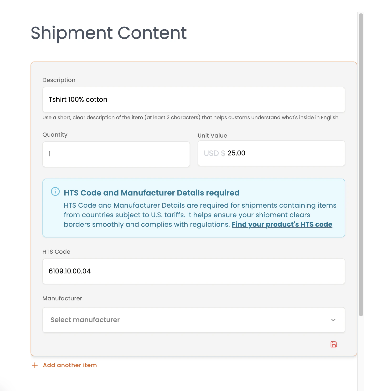 HTS-10编码用于确认进入美国的商品类型。美国海关使用它来确定适用的关税税率。- 必须恰好为10位数字